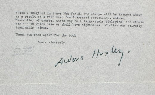 Орвел је управо објавио своју револуционарну књигу 1984, која је добила сјајне критике из готово свих делова енглеског говорног света. Његов професор француског, испоставиће се, био је нико други до Олдос Хаксли, који је неко време предавао на Итону, пре него што је написао Врли нови свет (1931), други велики дистопијски роман XX века. У суштини, иако хвали 1984, Хаксли тврди да је његова верзија будућности вероватнија од оне коју нуди Орвел. У Хакслијевој наизглед дистопијској Светској Држави, елита забавља масе до потпуног покоравања уз помоћ отупљујуће дроге зване сома и бескрајног наслађивањима необавезним сексом. Орвелова Океанија, с друге стране, држи масе под контролом…