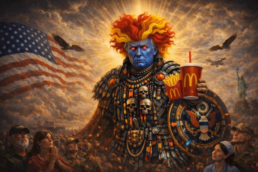 Пише: Вук Бачановић Постоји нешто истовремено дубоко демонски цинично, узнемирујуће и бурлескно у Трамповој најновијој АИ објави : човјек који је деценијама партијао са Џефријем Епстином, који је о њему говорио као о „сјајном типу“ са укусом за „млађе жене“, сада се појављује као месијански исцјелитељ, бијели протестантско-ционистички „Христос“ који као да је „васкрсао“ из нацистичке пропаганде о плавом аријевском иберменшу и који руком дарује свјетлост болеснику, док су у позадини орлови, борбени авиони и…
