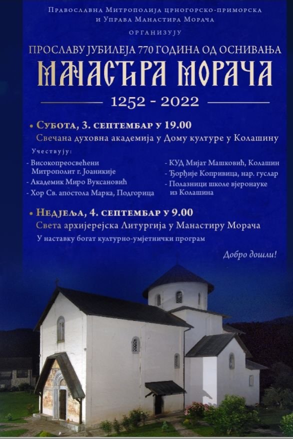 Mitropolija crnogorsko-primorska i Uprava manastira Morača 3. i 4. septembra organizuju proslavu jubileja – 770 godina od osnivanja manastira Morače (1252-2022).