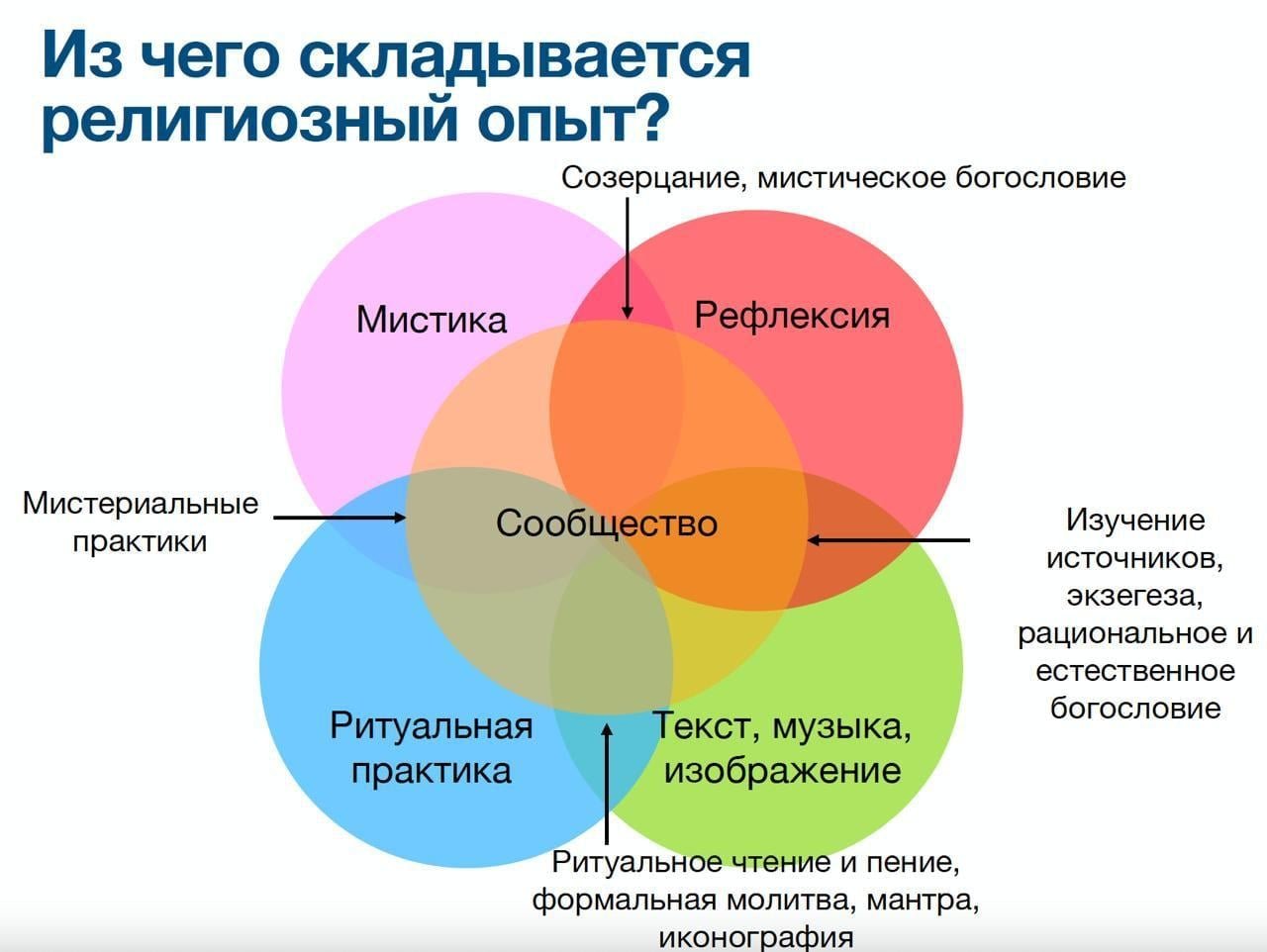 У ширем смислу, религиозно искуство обухвата пет главних области духовног живота и делатности: