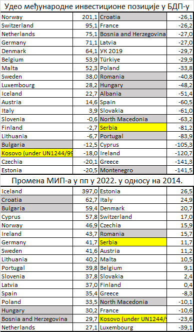 Nepovoljniju relativnu vrednost MIP-a od Srbije imalo je pet zemalja: Crna Gora, Grčka, Irska, Kipar i Portugalija. Crna Gora i Grčka su imale gotovo identičnu negativnu vrednost odnosa svojih potraživanja i dugovanja inostranstvu: -141,3% i -141,5%.
