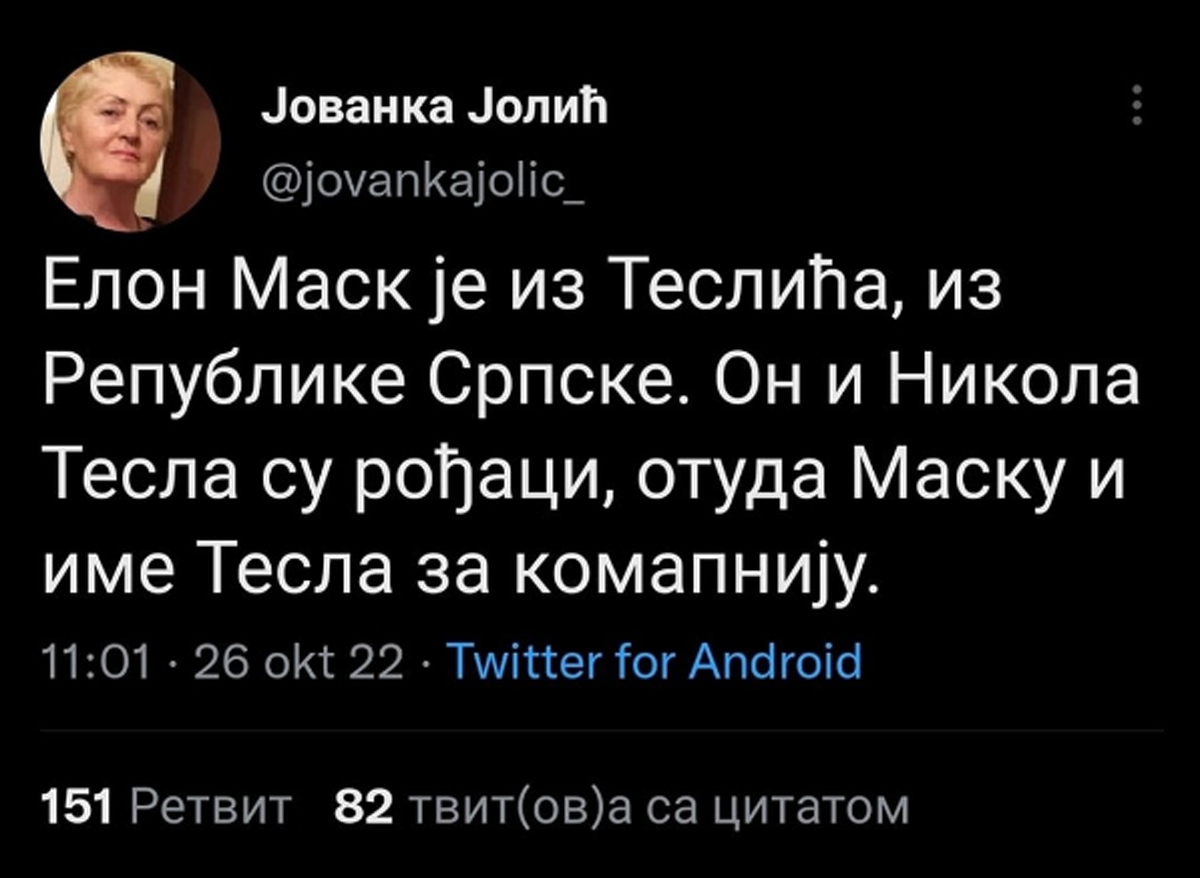 Сви људи на свијету су онтолошки Срби. Разлика између оних које препознајемо као Србе и свих осталих искључиво је епистемолошка. Наиме, ови потоњи су Срби који су подлегли вишетисућљетној нефилској пропаганди због које су заборавили да су Срби. Међутим, на несрећу Нефила, етимологија нуди краљевски пут према вјековима затираној истини. Руси су расељени Срби. Пољаци су Срби у пољу. Загреб је заграђе иза древног Србобрана. Чак је и Илон Маск подријетлом из Републике Српске, премда је овдје Јолић нешто опрезнија па оставља простор да се можебитно ипак вара.