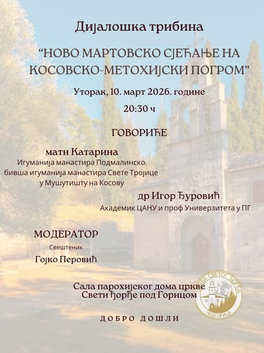 Дијалошка трибина „Ново мартовско сјећање на косовско-метохијски погром, одржаће се у уторак, 10.марта у парохијској сали Цркве Светог Ђорђа под Горицом, са почетком у 20.30.