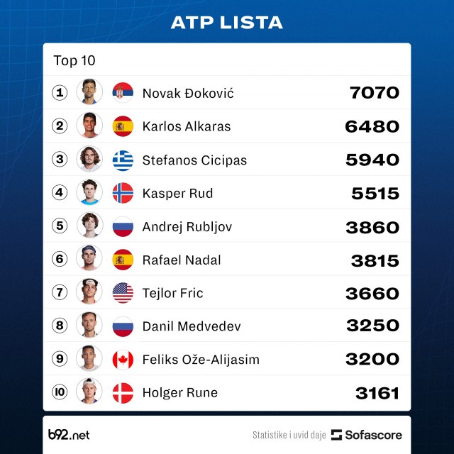 Novak ima 7.070 bodova na prvom mestu, 590 više od prvog pratioca Karlosa Alkarasa, dok je treći Stefanos Cicipas.
