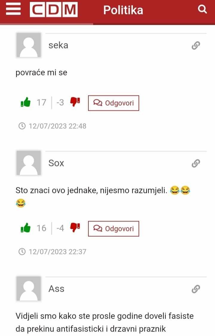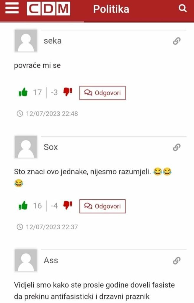 Дочим, количина малограђанштине која се може прочитати у коментарима испод прилога може се мјерити вагонима. Све је то уобичајени бал приземности, мржње и злољубља, какав се редовно може прочитати у коментаторским фуснотама овог портала. Ево, неких насумице изабраних илустрација: