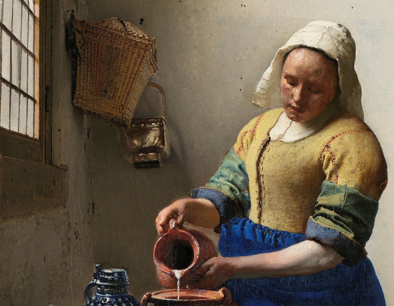 Za razliku od Rembranta ili Franca Halsa, koji su znali da uhvate pokret u letu, da prikažu nešto što je potrajalo samo delić sekunde, Vermer nas uvodi u svet u kome se vreme svojevoljno zaustavilo i u kome su se granice sadašnjeg trenutka razmakle dovoljno da u njima duh može opušteno da luta i da svuda zaviruje. Pogledajmo sad sliku Mlekarica, nazvanu tako verovatno zato što je na njoj prikazana mlada žena, koja iz glinenog vrča presipa mleko u posudu na stolu. Izlomljeni komadi bajatog hleba sugerišu nam da je u toku pripremanje omiljenog narodnog jela. Ovom žanrovskom scenom Vermer se uklapa u tradiciju glorifikovanja rada i ugodnog kućnog ambijenta koja je u 17. veku oblikovala ukus klijenata iz redova buržoazije i srednje klase. O žanrovima su napisani tomovi knjiga a mi ćemo sebi priuštiti privilegiju da se bavimo detaljima. Detaljima koji nam pokazuju da slikarstvo počinje tamo gde prestaje priča o tome šta je na slici predstavljeno. Usredsredićemo se na tanušan mlaz mleka i na lakoću kojom osoba na slici drži težak vrč. Bilo bi logično da to mleko izruči mnogo brže, ali ne, ona kao da želi da pokret uspori do krajnjih granica i da nas uvede u neku novu dimenziju u kojoj je vreme za kontemplaciju neograničeno. Slobodni smo da proučavamo da li je otvor vrča iz koga curi beli mlaz zaista optičko središte slike, da li mu se zaista može pripisati erotska konotacija, da li je nepojmljiva količina skupog plavog pigmenta odlučujuća za hromatski sklad kompozicije, da li je tačkasto nanošenje boje na komadima hleba nagoveštaj impresionizma ili posledica korišćenja misteriozne camera obscura?