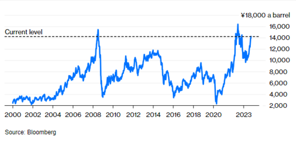 Јапан је можда најбољи пример овог нафтно монетарног коктела. Јен лебди око најнижег курса према долару у последњих скоро тридесет пет година, чиме су деривати нафте постали известан луксуз. Прошлог месеца, јапанска влада била је принуђена да продужи субвенције за гориво до краја године након што је малопродајна цена бензина скочила на рекордних 186,5 јена (1,24 долара) по литру, чиме је прескочена највиша вредност из 2008. године.