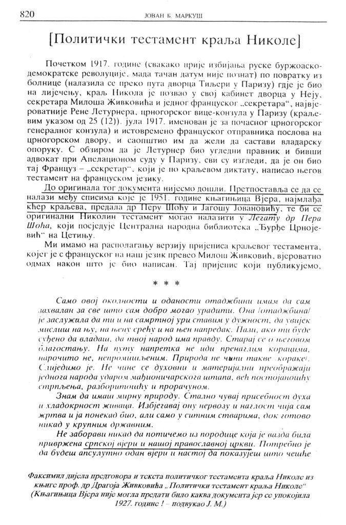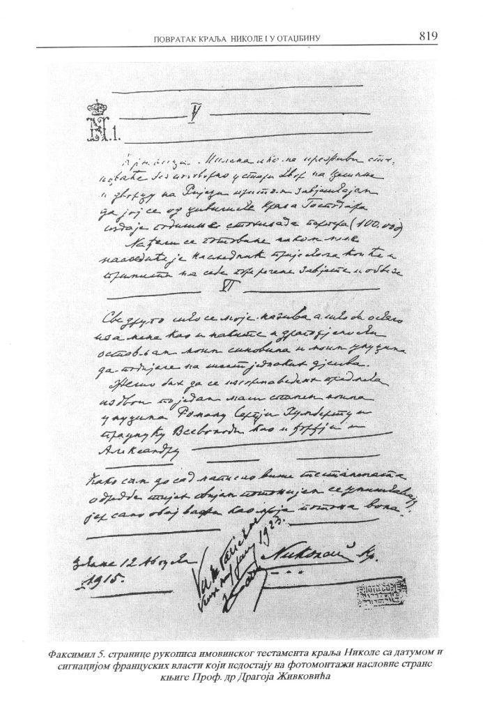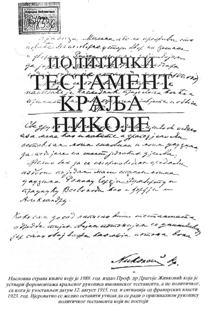 Drugim riječima podmeće se rukopis imovinskog testamenta kako bi pomislili da se radi o originalnom rukopisu političkog testamenta, koji nema veze sa političkim testamentom. Ja sam 2000.g radeći na mojoj knjizi ,, Povratak kralja Nikole I u otadžbinu“, tražio u arhivu Narodnog muzeja Crne Gore da mi se kopira original imovinskog testamenta kralja Nikole sa koga je dr Živković kopirao rukopis za naslovnu stranu, ali je on nestao iako se u arhivu znalo ko ga je posljednji koristio. Na svu sreću ja sam imao jednu ne baš kvalitetnu fotkopiju testamenta koju sam dobio od upravnice Dvora kranja Nikole 1987.g.i koju sam iskoristio za knjigu na kojoj sam radio. U arhivu Narodnog muzeja Crne Gore tražio sam testament ponovo i prije nekoliko godina, ali imovinski testament je ili trajno nestao ili je negdje sklonjen.