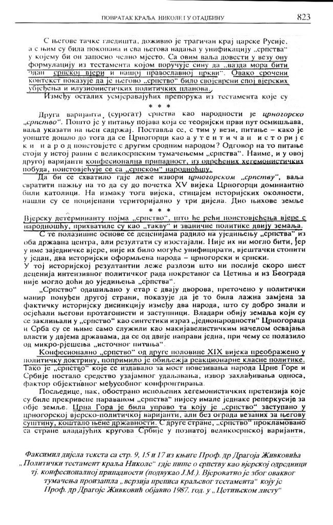 Na primjer, kada tvrdi da je konfesionalna pripadnost u Srba istovjetna sa narodnošću, nudi naučno neodrživu tezu. Takva tvrdnja ne može imati naučnu podlogu, jer se, bez sumnje, radi o dvjema odrednicama koje se ne mogu poistovjećivati! Još u 19. vijeku, učitelji pa čak i učenici crnogorskih osnovnih škola pravili su razlike između ta dva pojma. Živkovićevo tvrđenje da su „Vjersku determinantu pojma ‘srpstvo’, što će reći poistovjećivanja vjere s narodnošću“ prihvatile i „zvanične politike dviju zemalja“, možemo shvatiti kao njegov separatistički trik.“ (str. 195). Pored nespornog falsifikovanja političkog testamenta, da bi knjiga dr Živkovića djelovala što uvjerljivije, na naslovnoj strani stoji naslov „Politički testament kralja Nikole“ a ispod njega je napravljena fotomontaža faksimila rukopisa imovinskog testamenta sa kojeg je izostavljen datum „Cetinje 12. avgusta 1915“, kako se ne bi moglo otkriti da se radi ustvari o imovinskom testamentu koji je sačinjen ranije od političkog iz 1917.godine.