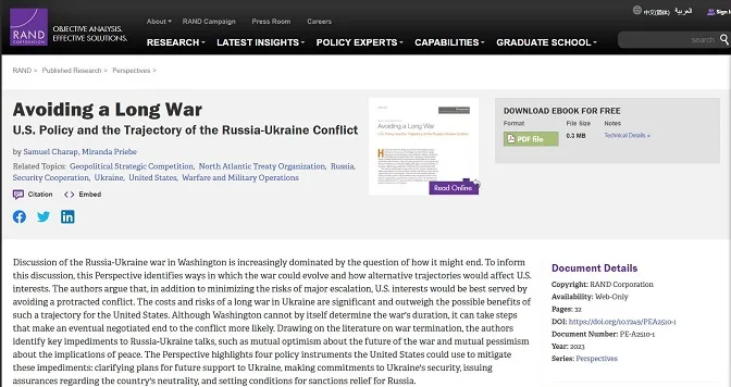 Корпорација РАНД, утицајни труст мозгова финансиран непосредно од стране Пентагона, објавила је документ у ком се каже да продужавање посредничког рата директно штети САД и савезницима, упозоравајући Вашингтон да би требало да избјегне „развлачење сукоба“ у Украјини.