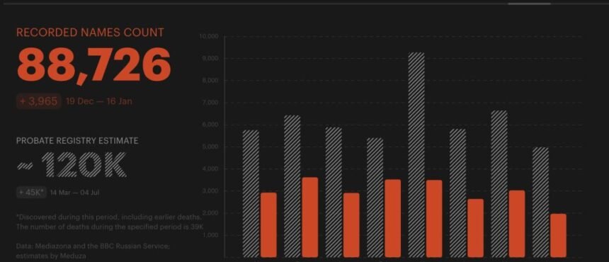 Према најновијим подацима Медиазоне, потврђено је 88.726 погинулих руских војника у борбама од фебруара 2022. године. Медиазона, користећи податке из матичних књига оставина, процјењује да број може бити чак 120.000. То је далеко од бројева које пласира украјинска обавјештајна служба, на којима ЦИА заснива своје процјене.