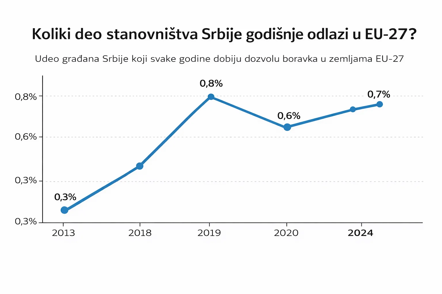 Godine 2013, prve za koju Eurostat daje podatke i ujedno prve pune godine vlasti Srpske napredne stranke u Srbiji, u zemlje Evropske unije, bez Ujedinjenog Kraljevstva, odselilo se 0,33 odsto stanovništva Srbije. Jedanaest godina kasnije, 2024. godine, taj udeo iznosio je 0,70 odsto. Broj građana Srbije koji odlaze u zemlje Evropske unije povećao se, dok se broj stanovnika Srbije istovremeno smanjivao. Zbog toga je rastao i procenat ljudi koji se iseljavaju.