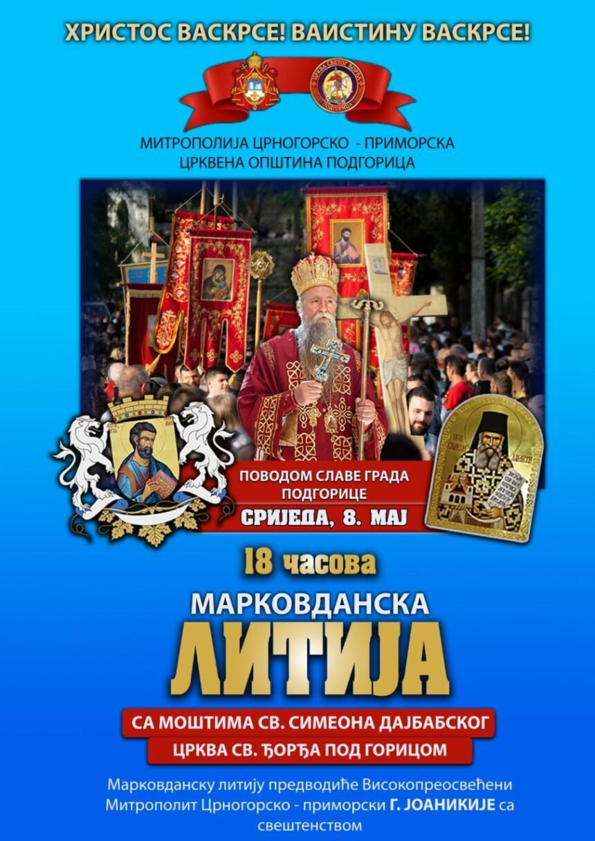 Povodom slave grada Podgorice, u srijedu 8. maja iz crkve Svetog Đorđa pod Goricom u 18 časova, krenuće tradicionalna Markovdanska litija sa moštima Prepodobnog Simeona Dajbabskog.