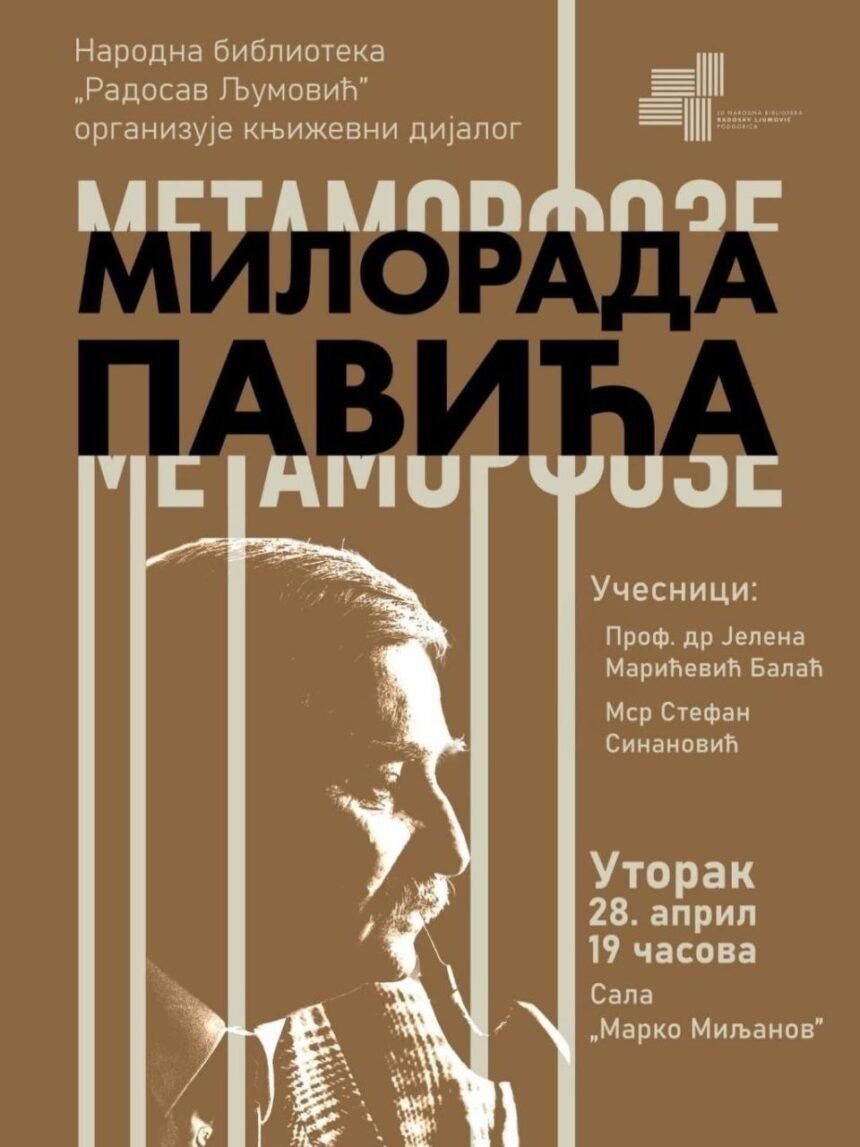У уторак, 28. априла, с почетком у 19 часова, у сали „Марко Миљанов”, биће одржан књижевни дијалог „Метаморфозе Милорада Павића”.