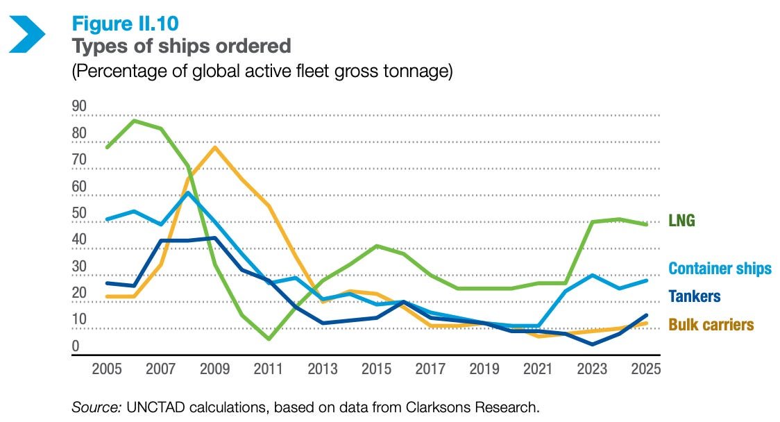У прегледу поморског транспорта из 2025. године, UNCTAD је забележио да „капацитет флоте надмашује потражњу у кључним сегментима пословања као што су контејнерски танкери и танкери за превоз производа“ (стр. 8) и очекују да ће глобална танкерска флота наставити да се шири до краја текуће деценије.