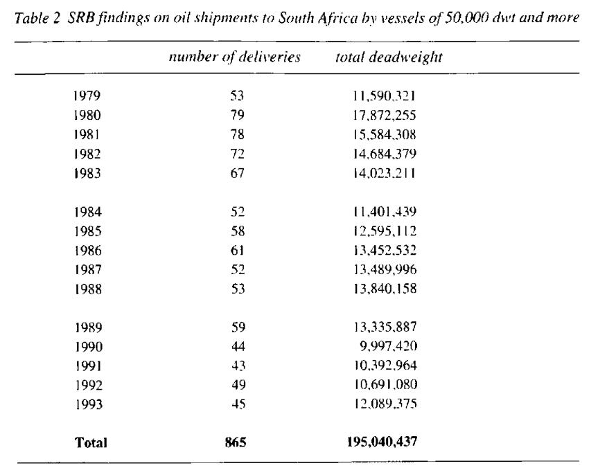 Канцеларија за истраживање бродарења показује да је током четрнаест година између 1979. године и 1993. године, неких 865 бродова са укупним товаром тешким 180 милиона тона у потаји достављало нафту Јужној Африци – просечно један брод недељно. Обим испорука овом притворном трговином износио је 81 одсто укупне јужноафричке потрошње потребне у то време.