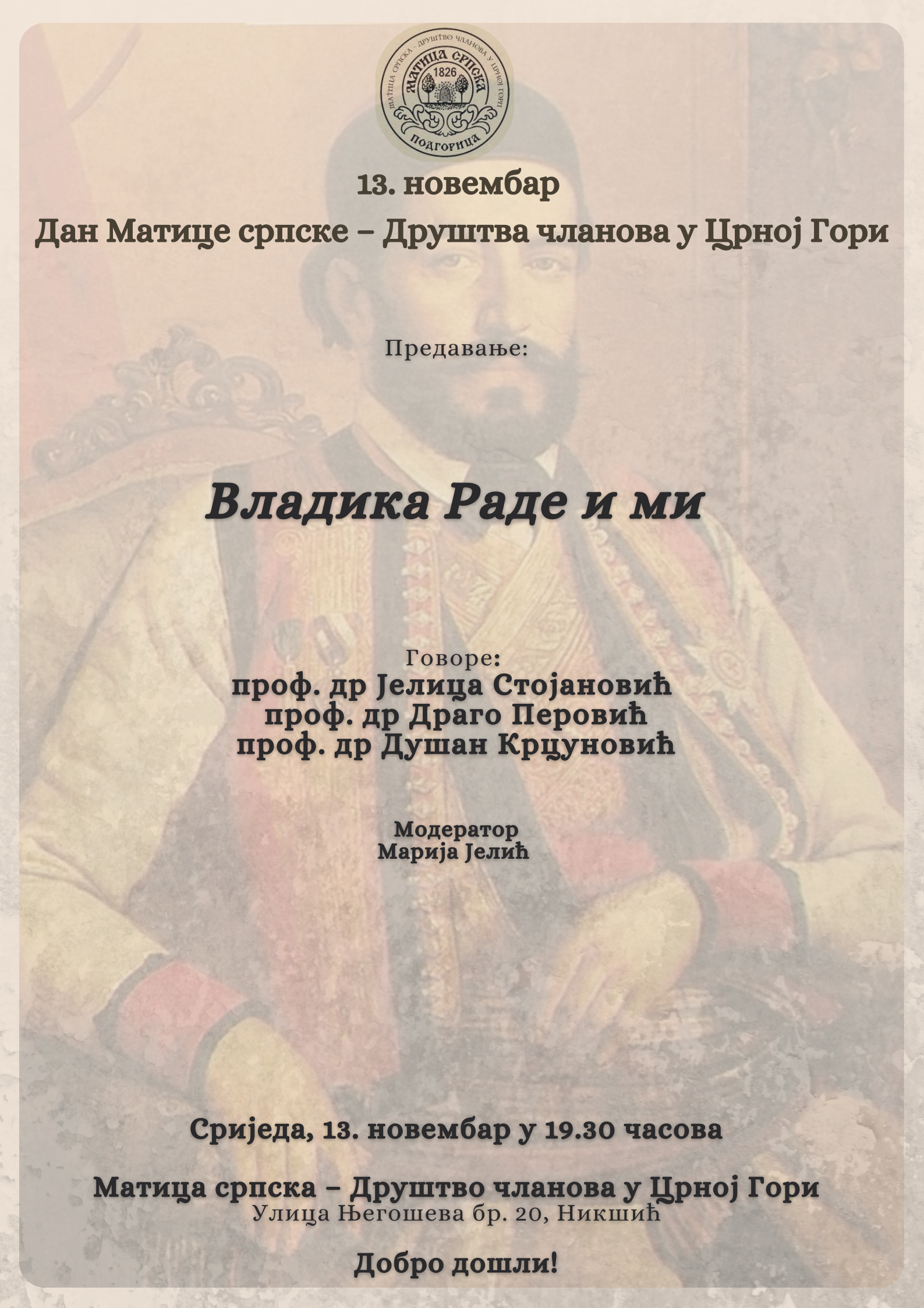 Позивамо вас да заједно обиљежимо Дан Матице српске — Друштва чланова у Црној Гори, 13. новембра на дан рођења Петра II Петровића Његоша. Програм Дана Матице почиње предавањем ,,Владика Раде и ми“ на коме ће се обратити проф. др Јелица Стојановић, предсједник Матице српске — Друштва чланова у Црној Гори, проф. др Драго Перовић и проф. др Душан Крцуновић. Након предавања ће услиједити отварање изложбе ,,Портрети митрополита црногорско-приморских“ академског сликара Весне Сушић. Изложбу ће отворити проф. др Саво Лаушевић.