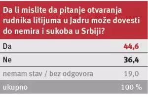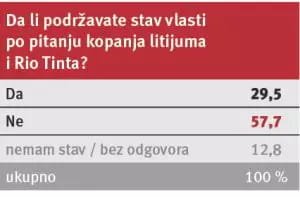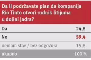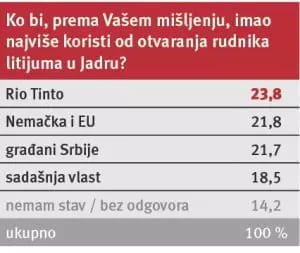 Za dva meseca intenzivne režimske kampanje procenat protivnika Rio Tinta je sa 55,5 porastao na skoro 60 odsto. A opao je, doduše, neznatno, i broj pristalica projekta “Jadar” na ispod 25 procenata od ukupnog broja izjašnjenih. Na pitanje ko će imati najveću korist od eventualnog otvaranja rudnika litijuma, samo 21,7 odsto ispitanika reklo je da su to “građani Srbije”, dok ukupno skoro tri četvrtine smatra da će najveću korist imati Rio Tinto, Nemačka i “sadašnja vlast”.