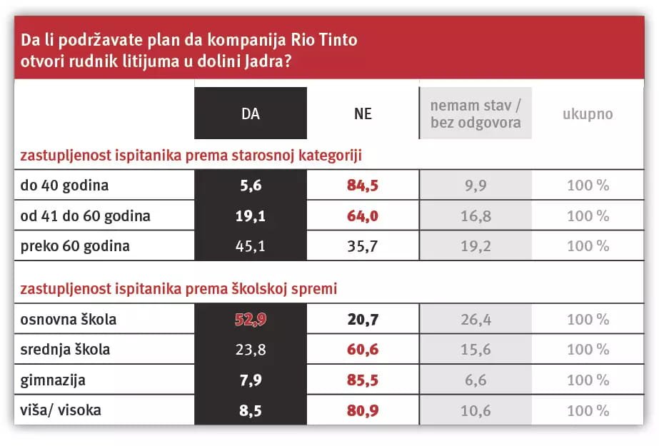 Dakle, tek u kategoriji ispitanika preko 60 godina (a suštinski i zapravo, tek u kategoriji onih starijih od 70) projekat Rio Tinta i Vlade Srbije ima većinsku, mada opet ne i apsolutnu podršku (45,1:35,7).