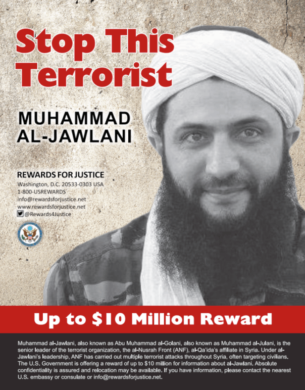 ХТС је већ сљедеће године био званично означен као терористичка организација од стране Сједињених Држава и Уједињених нација; ал-Џолани је добио исту етикету, уз цијену од 10 милиона долара за његову главу.