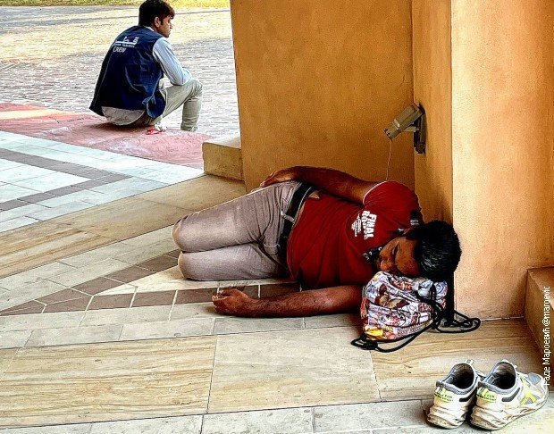 U bež je ogrnut i Nepalac, radnik lokalnog obezbeđenja, koji u Dohi radi tek nekoliko meseci. Dolazi iz zemlje u kojoj radnici zarađuju dolar dnevno i sa 300 do 400 dolara, uz plaćen stan, hranu i prevoz, skoro sav novac koji zaradi šalje kući.