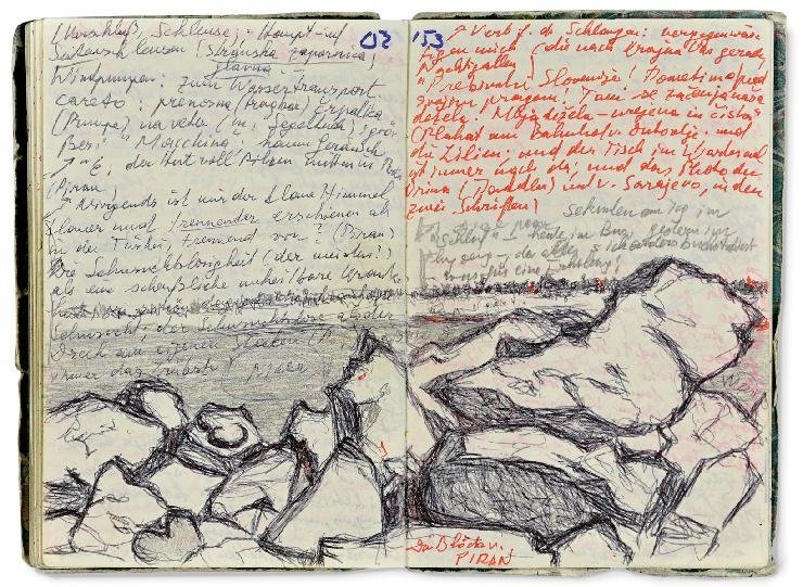 На основу факсимила изабраних цртежа из бележница (које аутори прилажу тексту) упадљиво је Хандкеово занимање за форме: на једном месту је нацртана само линија која одсликава форму степеница, на другом је илустрована форма олтара која је писца подсетила на крила слепог миша.