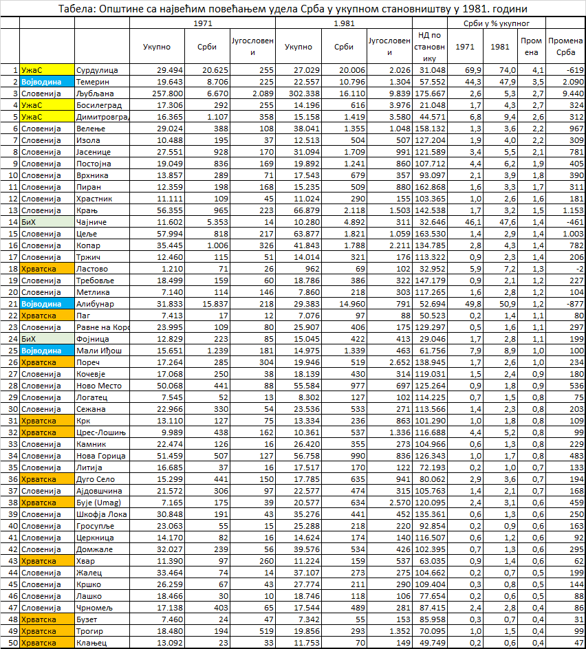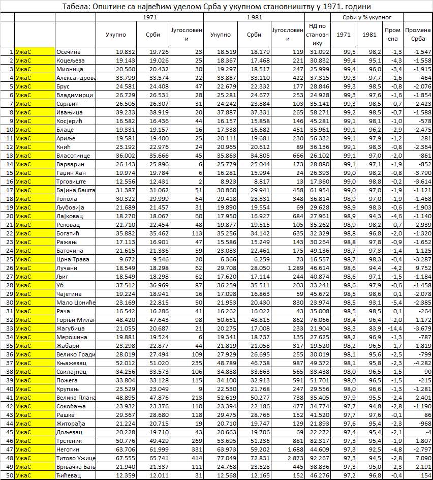 Овде смо, уместо жељених 30, приказали 50 општина које имају веома сличне карактеристике у погледу демографских кретања. Свих 50 са највећим уделом Срба (до 97,2%) налазило се на територији Србије изван покрајина и њих 48 је имало пад удела Срба изузев Чајетине и Раче код којих је он повећан за 0,1%. Њих 15 је имало раст а 35 пад укупног броја становника. У збиру, смањење броја становника износило је 12.206 лица. Број Југословена повећан је у свих 50 општина, у збиру за 17.146. Значи, пад удела Срба у овим општинама био је последица промене изјашњавања из Србин у Југословен, а не бржег раста броја становника других националности (што је у неким општинама и био случај). Осим Титовог Ужица и Горњег Милановца, све ове општине су биле испод просечног нивоа развијености у СФРЈ.