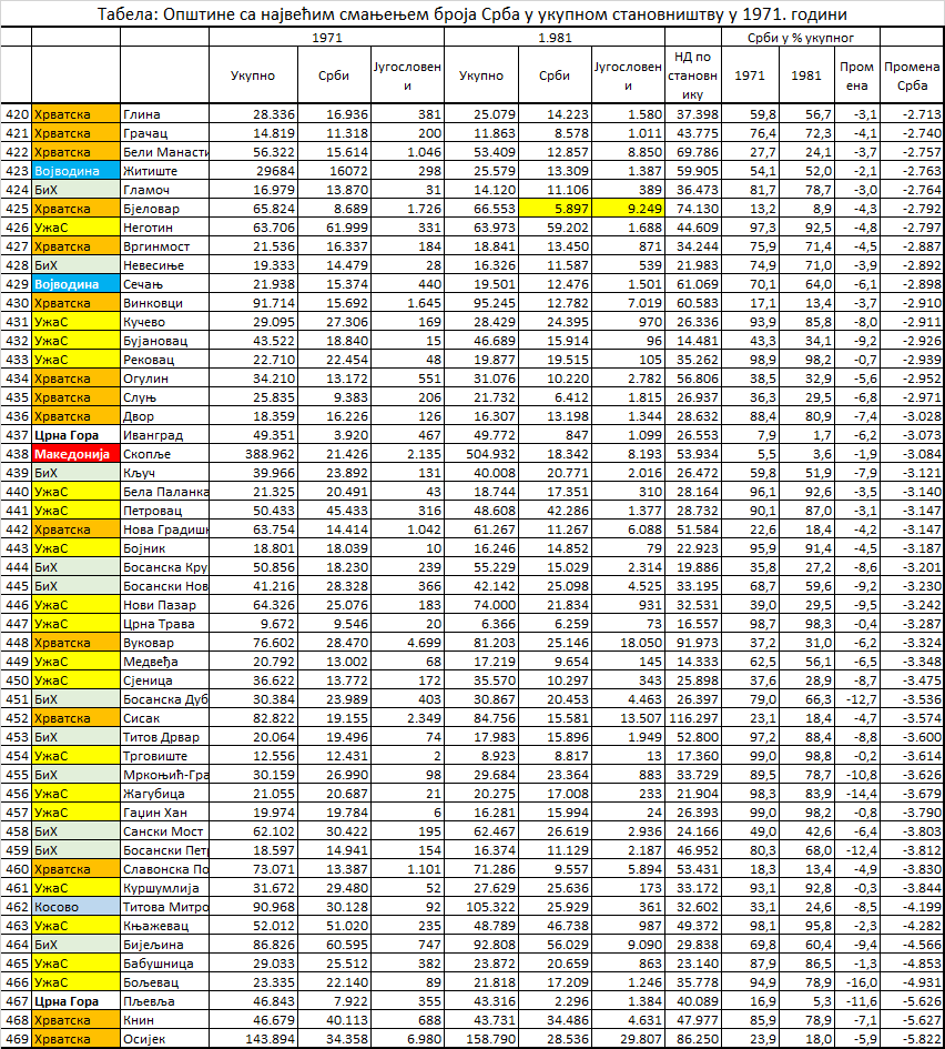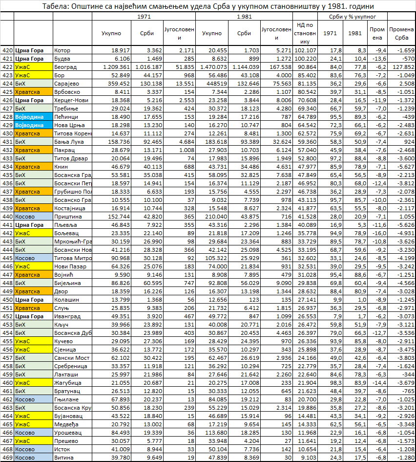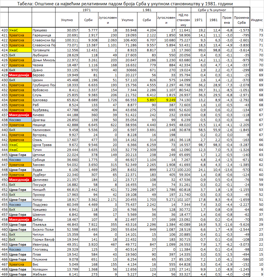 И општине са релативно највећим смањењем броја Срба су биле општине са њиховим малим бројем: у збиру је у 50 приказаних општина живело 142.428 Срба у 1971. и број је смањен на 87.711 у 1981. години.