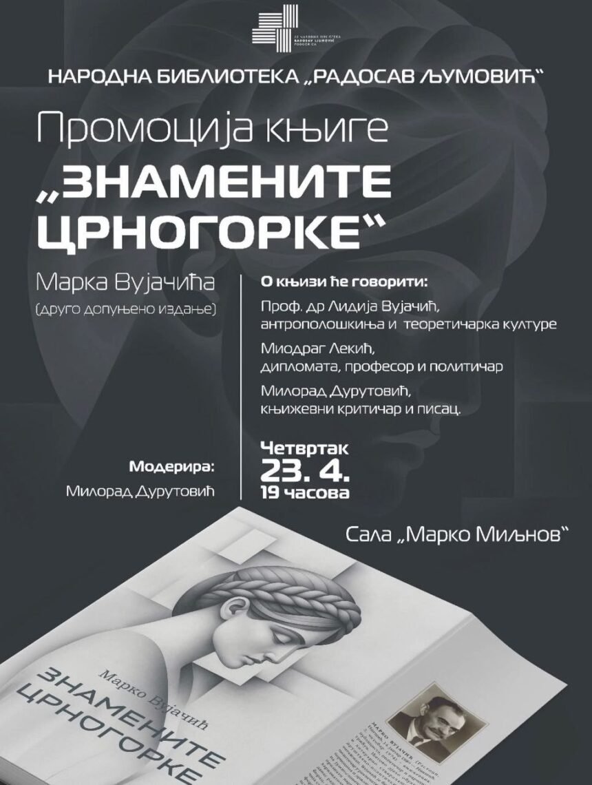 U četvrtak 23. aprila sa početkom u 19 časova u sali “Marko Miljanov”, održaće se promocija drugog a dopunjenog izdanja knjige “Znamenite Crnogorke”, autora Marka Vujačića.