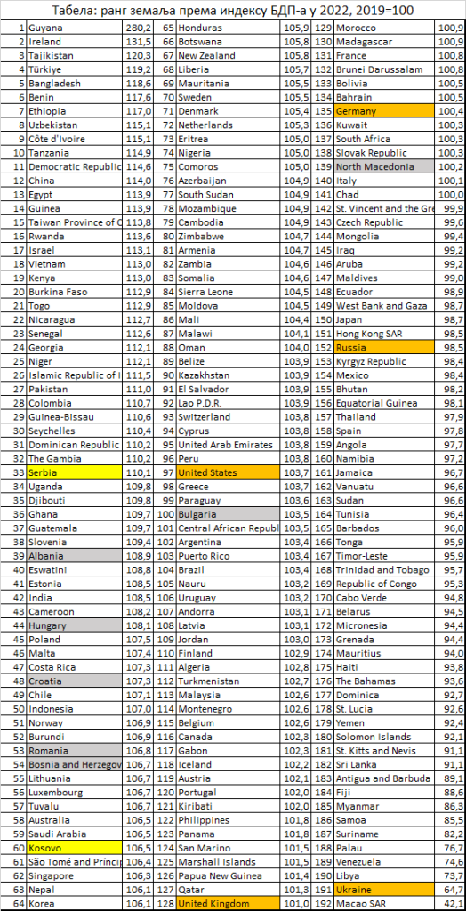 Od 192 zemlje i teritorije sa podacima veći BDP u 2022. u odnosu na početnu 2019. imalo je 141 a manji 51. Kada bi postojao neki indeks rigoroznosti primenjenih mera protiv virusa COVID-19 za sve zemlje mogli bi da izmerimo ima li neke veze, negativne, između ovih mera i dinamike BDP-a, uz pretpostavku da što su mere bile rigoroznije, to je manji BDP u 2022. u odnosu na 2019.