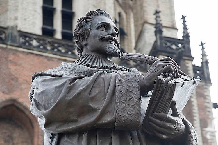 Od čudesnih stvari u gradu Delftu, posebno uzbuđenje priredila je Maja Vodopivec, kad je moju drugaricu životnu Sanju i mene dovela na glavni trg, kod Nove crkve, pred visoki spomenik Hugu Grotiju. On se holandski zvao Huig de Groot, ponekad Hugo de Groot, a u svijetu je poznat pod latinskim imenom Hugo Grotius. Spomenik mu je načinio holandski kipar Frits Sieger i ondje je otkriven 1886. U rukama Grotije drži veliku knjigu. Hugo Grotius je rođen u 16. stoljeću, godine 1583, a umro u 17., godine 1645. Za mene je Grotije odavno najbolji primjer za utopijskog čovjeka. To je onaj čovjek koga Ortega Y Gasset smatra utopijskim bićem. Kažem odavno, i jeste odavno, jer se više ne mogu sjetiti kad sam prvi put čitao govor Joséa Ortegu y Gasseta o prevođenju kao utopijskoj djelatnosti. U tom govoru Ortega Y Gasset polazi od riječi nekog profesora izrečene u Collège de France kako je nemoguće prevesti neke njemačke mislioce, te predlaže da se istraži pa potom povede rasprava o tome koje je filozofe moguće prevesti, a koje nije. Tu govornik iskazuje tvrdnju kazanu pitanjem: „Zar prevođenje nije beznadežan utopijski trud?“