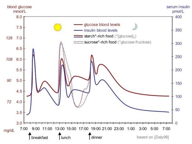 Дијаграм флуктуације шећера у крви (црвено) и шећер-снижавајућег хормона инсулин (плаво) код људи у току дана током кога се узимају три оброка. Додатно је приказан ефекат оброка богатог шећером и скробом