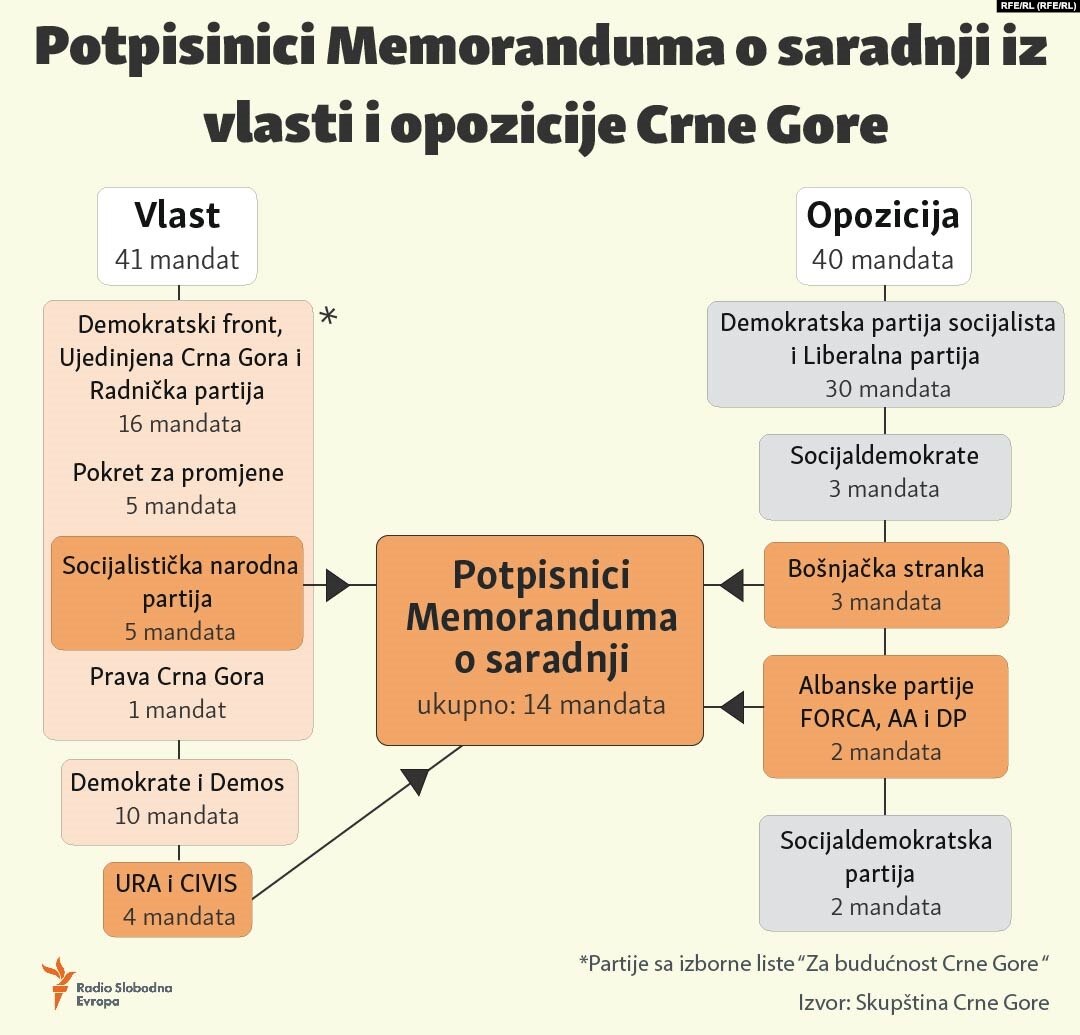 - Dosadašnji partneri iz vlasti Demokratski front i Demokrate, jasno su protiv i preferiraju tehničku vladu koja bi organizovala izbore. Socijalistička narodna partija, takođe iz bloka vlasti, iako potpisnica Memoranduma još “vaga” kakav će odnos zauzeti .