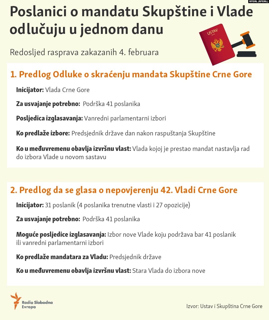 Krivokapićeva Vlada podnijela je zahtjev za skraćenje mandata Skupštini Crne Gore navodeći da bi se na taj način stvorili uslovi za raspisivanje vanrednih parlamentarnih izbora. Za odluka o skraćenju mandata potreban je takođe 41 glas. Parlamentarna aritmetika, prema trenutnim političkim najavama o glasanju, upućuje da ovaj prijedlog neće imati većinu.