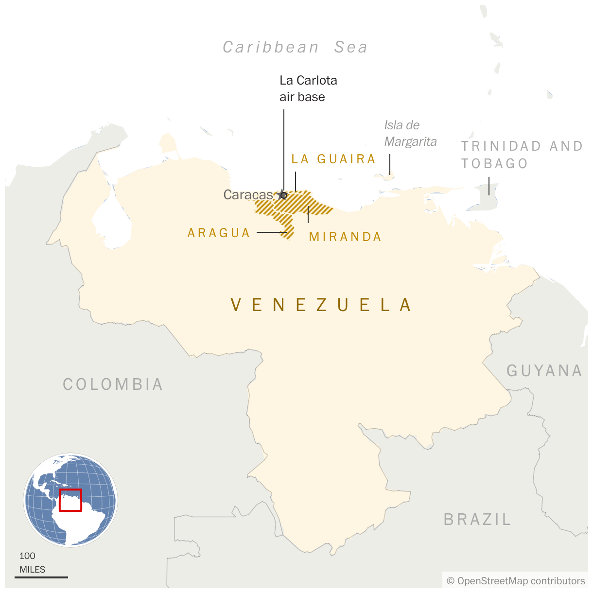 Brojni video materijali pokazuju eksplozije vojnih postrojenja u i oko Karakasa, uključujući u vazduhoplovnoj bazi Generalisimo Francisko de Miranda, koja je takođe poznata kao La Karlota, kao i u luci La Gvaira severno od prestonice i na aerodromu Higerote oko sto kilometara istočno od venecuelanskog glavnog grada.