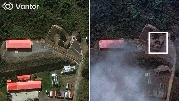Oštećenje podzemnog ulaza u tvrđavi Tiuna je snimljeno na satelitskom snimku od 3. januara (desno), u poređenju sa slikom od 22. decembra 2025. (Vantor/Satelitski snimak ©2026 Vantor)