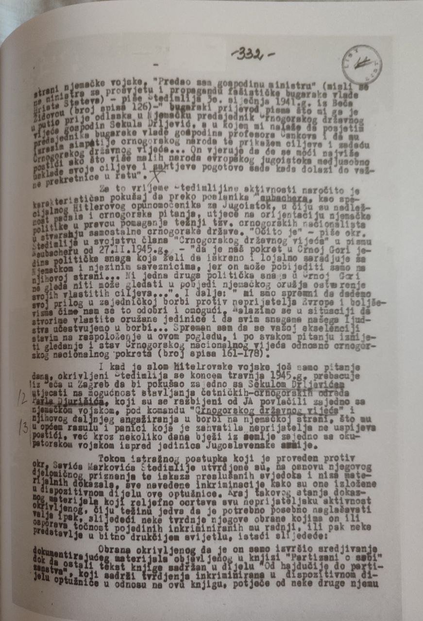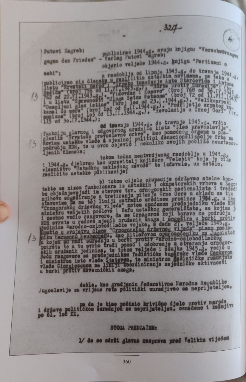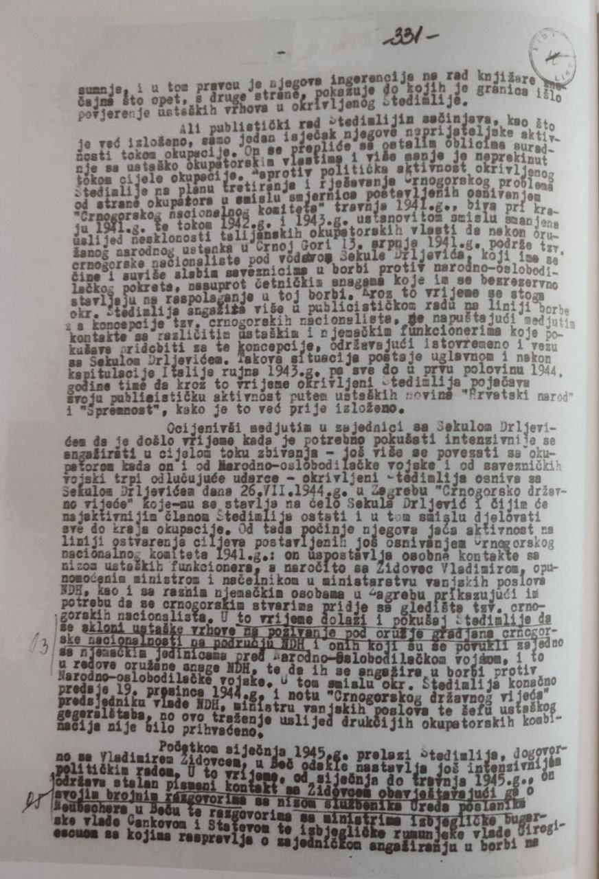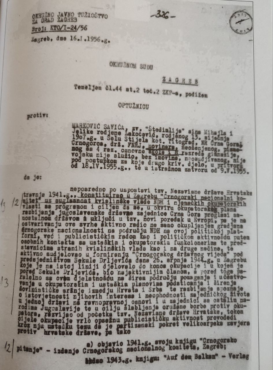 1.  neposredno po uspostavi tzv. Nezavisne države Hrvatske aprila 1941., konstituisao u Zagrebu „Crnogorski nacionalni komitet“ uz saglasnost i bliskost Vlade NDH i njenih okupatorskih zaštitnika s ciljem da se u okviru okupatorskog rasturanja jugoslovenske državne zajednice Crna Gora proglasi samostalnom „nezavisnom“ državom, koja će se priključiti italijanskom sistemu fašističke dominacije u Evropi. Po instrukcijama Crnogorskog nacionalnog komiteta NDH je preko svojih plaćenih formi i publicističkih radova pod političkom ekstremnošću ruta kroz kontakt sa istaknutim pripadnicima nemačkih kvislinških vlasti i s ciljem da se ovim putem otvorena propagandna mašinerija angažuje u fašističkoj mobilizaciji masa protiv Jugoslavije i protiv ideje zajedništva jugoslovenskih naroda.