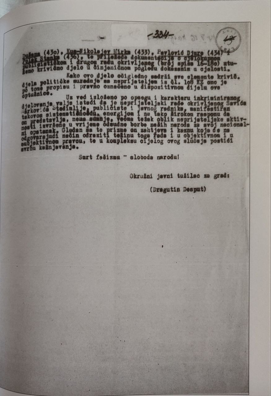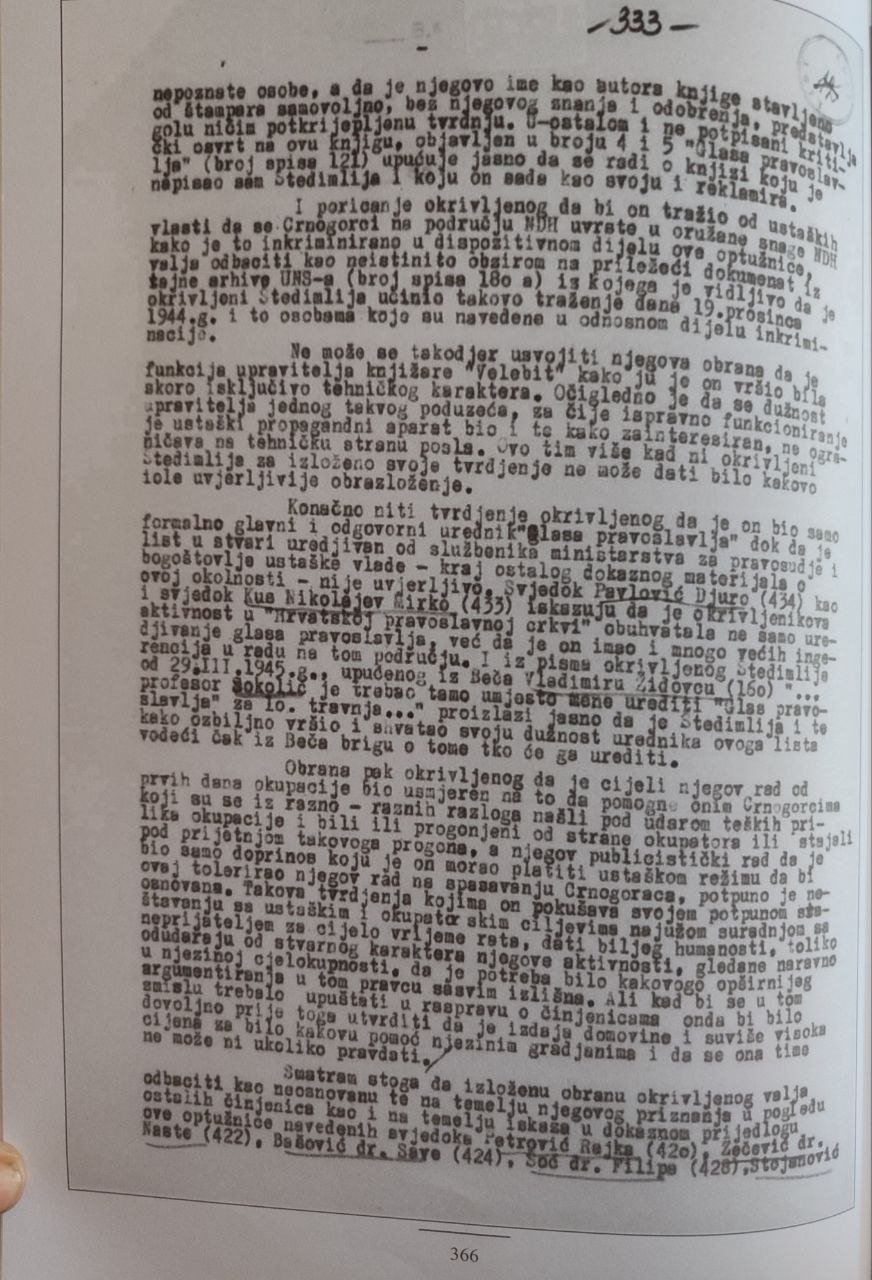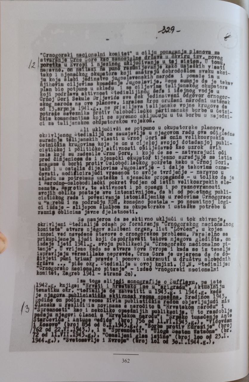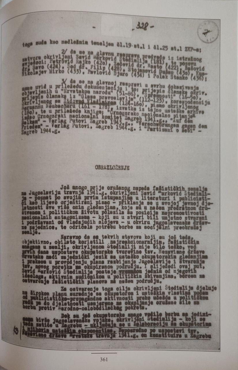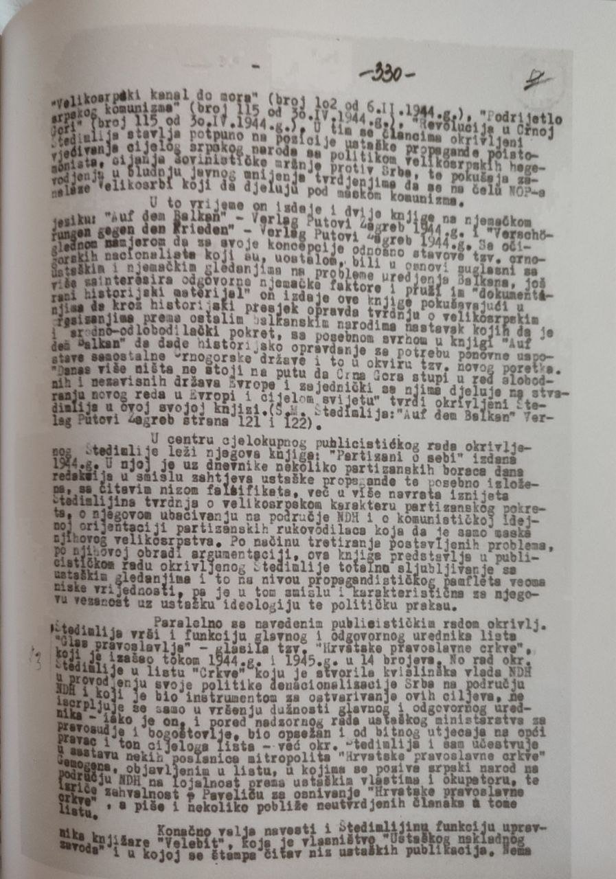 Zanimljivo je da se izdavačka politika FCJK u tom smislu nikako ne vodi dokumentovanim istorijskim činjenicama, a to je da Štedimlija pred sudom NR Hrvatske osuđen jer je:
