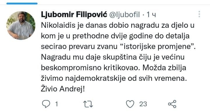 Istaknuti crnogorski i pomalo regionalni kolumnista Andrej Nikolidis sasvim očekivano (šteta što se ne može reći i opravdano) jedan je od ovogodišnjih dobitnika Trinaestojulske nagrade.